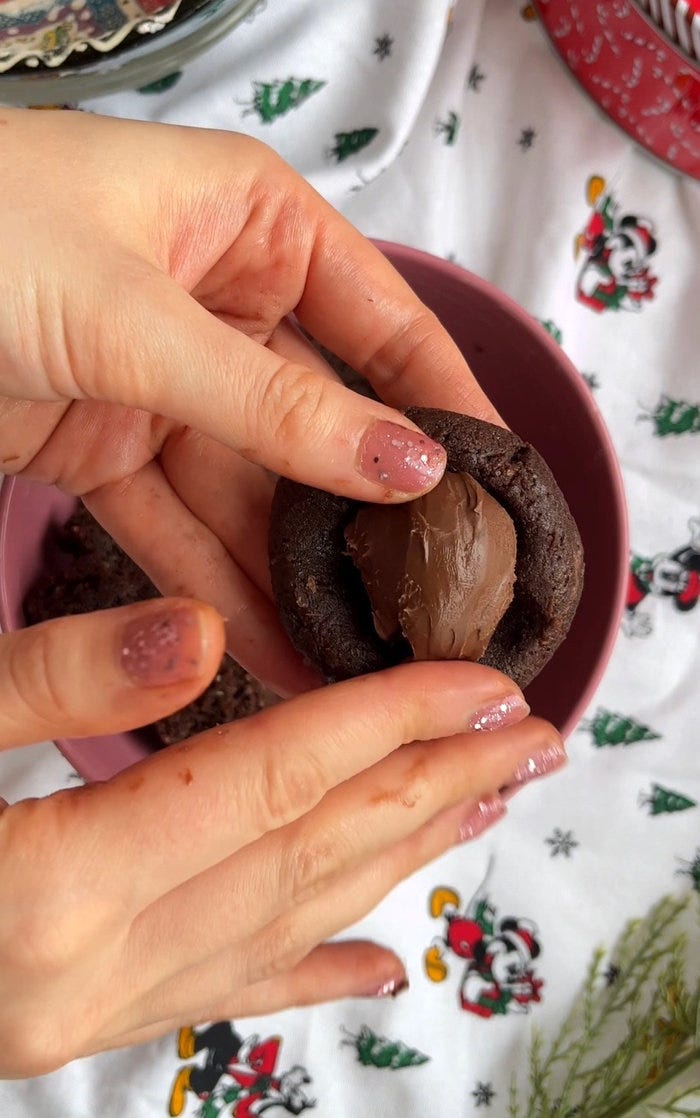 W międzyczasie rozgrzej piekarnik do 160 C (termoobieg). Po tym czasie wyjmij ciasto, urywaj kulki ciasta (patrz filmik na IG), rozpłaszcz każdą kulkę i do środka włóż zamrożoną kuleczkę Nutelli. Układaj na blaszce wyłożonej papierem do pieczenia w kilkucentymetrowych odstępach. Maksymalnie na blaszce powinno piec się 6 ciastek. Piecz 12-14 minut. Wyjmij ciasteczka i pozostaw do całkowitego wystudzenia.