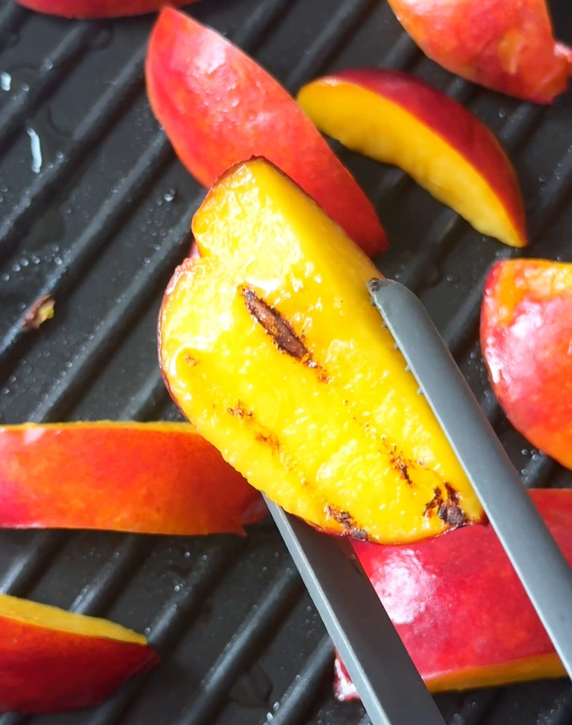 Nektarynki delikatnie natłuść oliwą. Grilluj na patelni grillowej lub grillu przez 1–2 minuty z każdej strony aż pojawią się paski. Dopraw szczyptą soli i opcjonalnie miodem jeśli lubisz na słodko.
