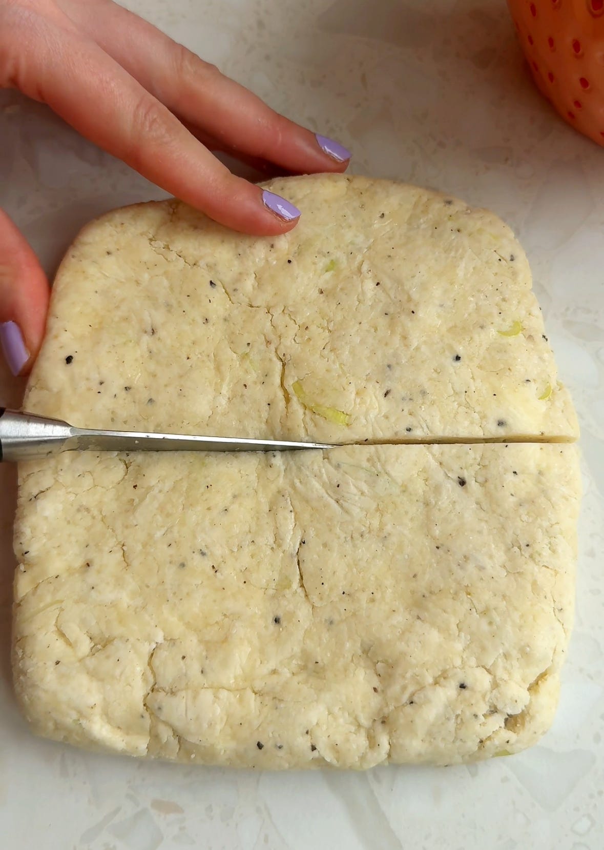 Dodaj schłodzone śmietanki. Mieszaj widelcem tylko do połączenia składników. Szybko zagnieć na kwadrat (mniej więcej) grubości ok 3 cm i zawiń w folię, wstaw do lodówki na 45 minut.
