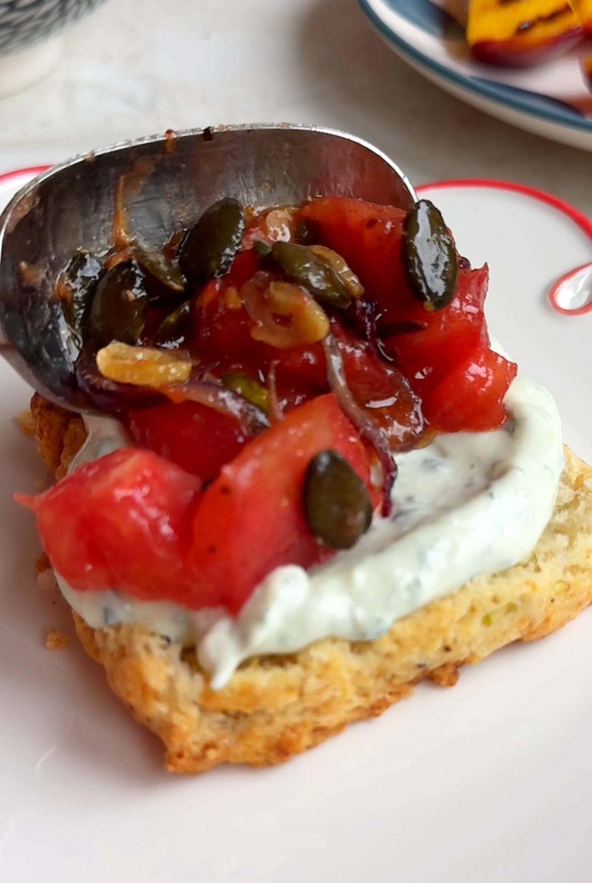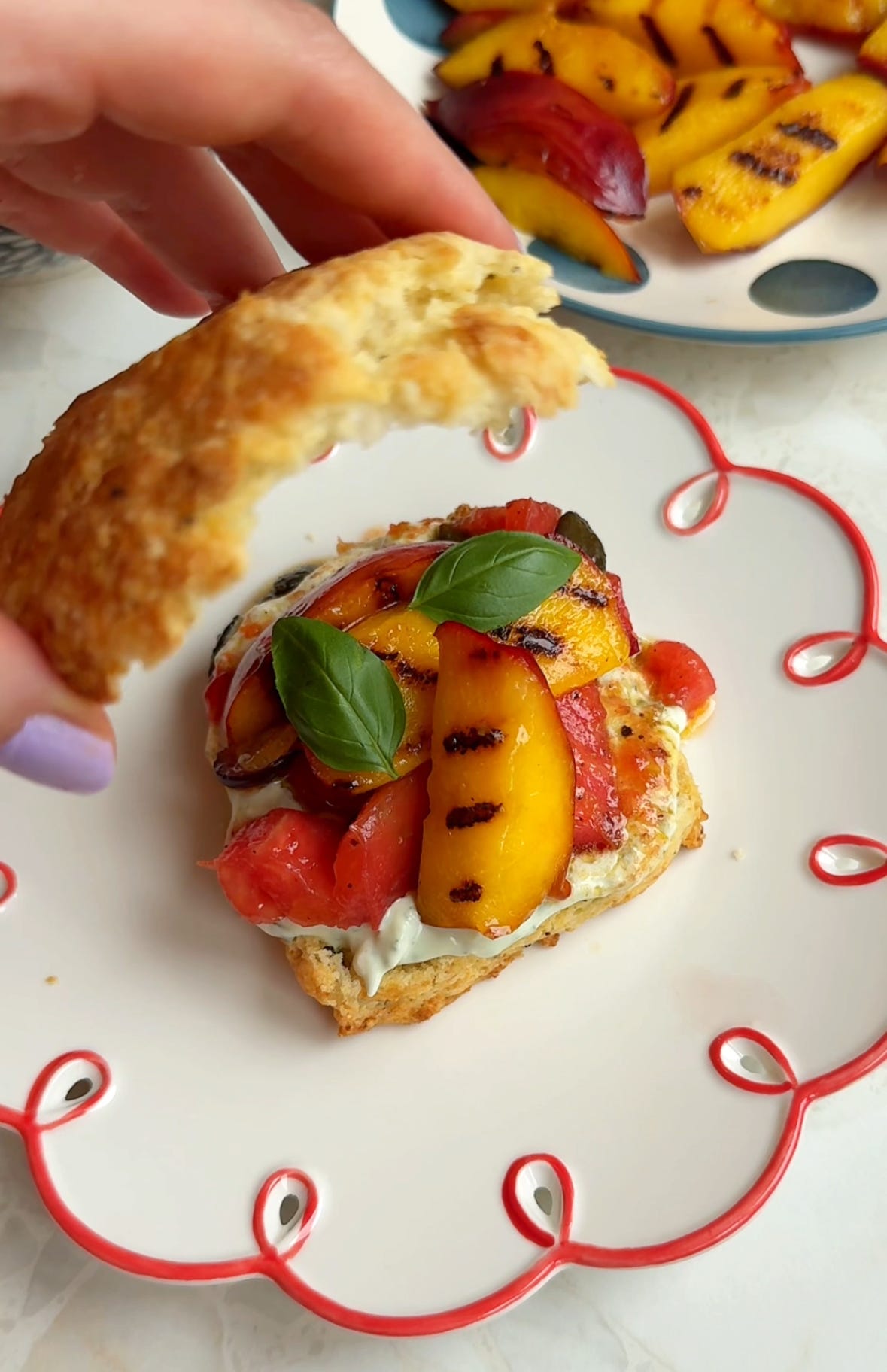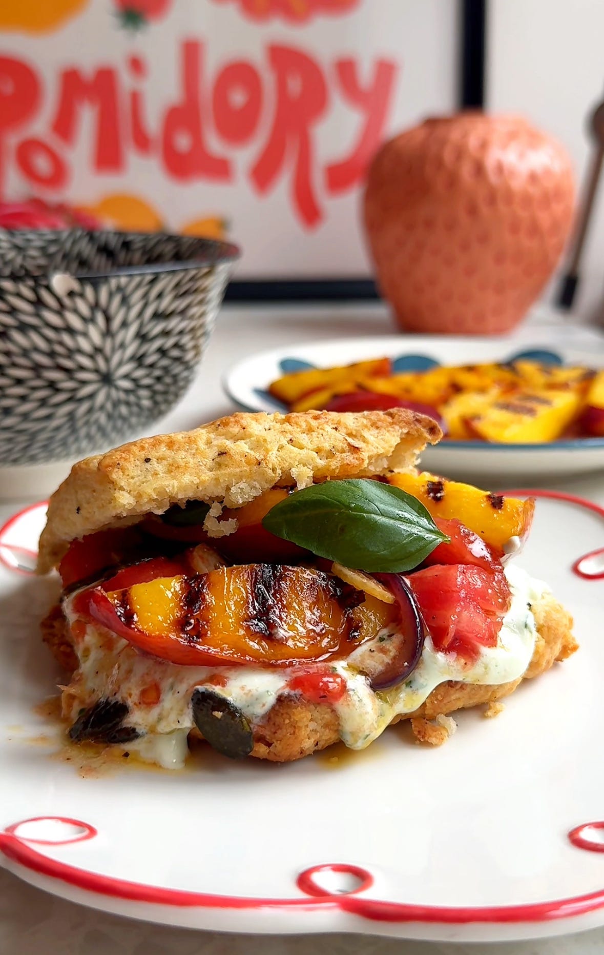 LETNIA KANAPKA – serowa bułeczka, ubijana ricotta, umamiczne pomidory i grillowana nektarynka!