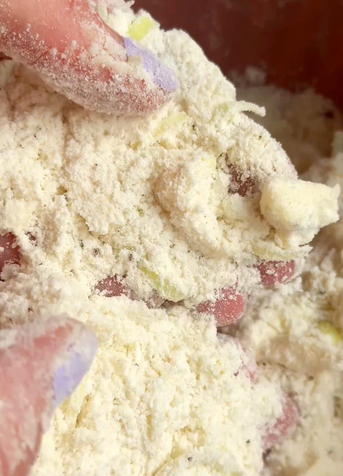 Rozetrzyj masło z mąką palcami. Chodzi o uzyskanie tekstury "mokrego piasku" – widoczne większe grudki masła są OK! Nie wyrabiaj, nie ocieplaj – im szybciej działasz, tym lepiej.