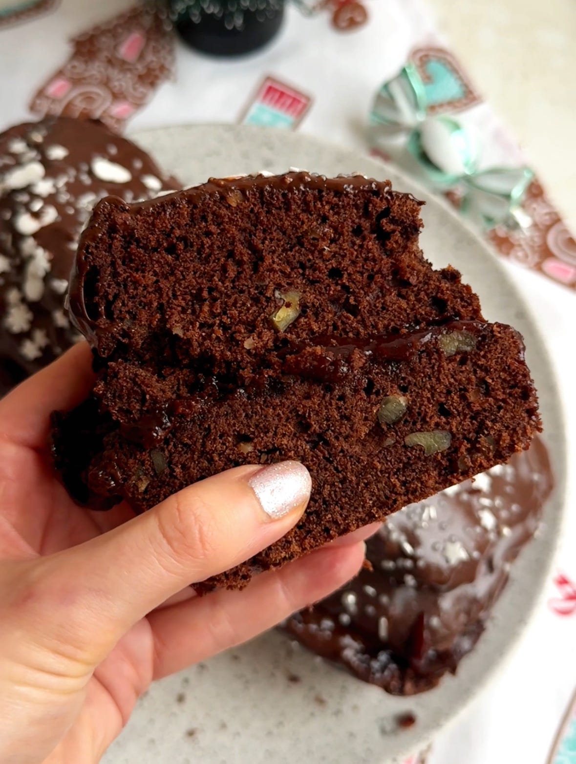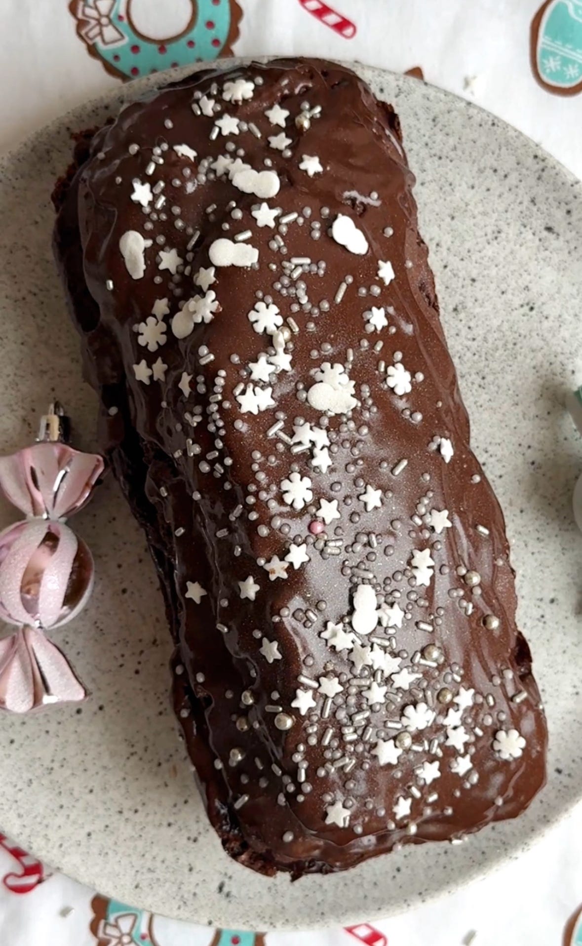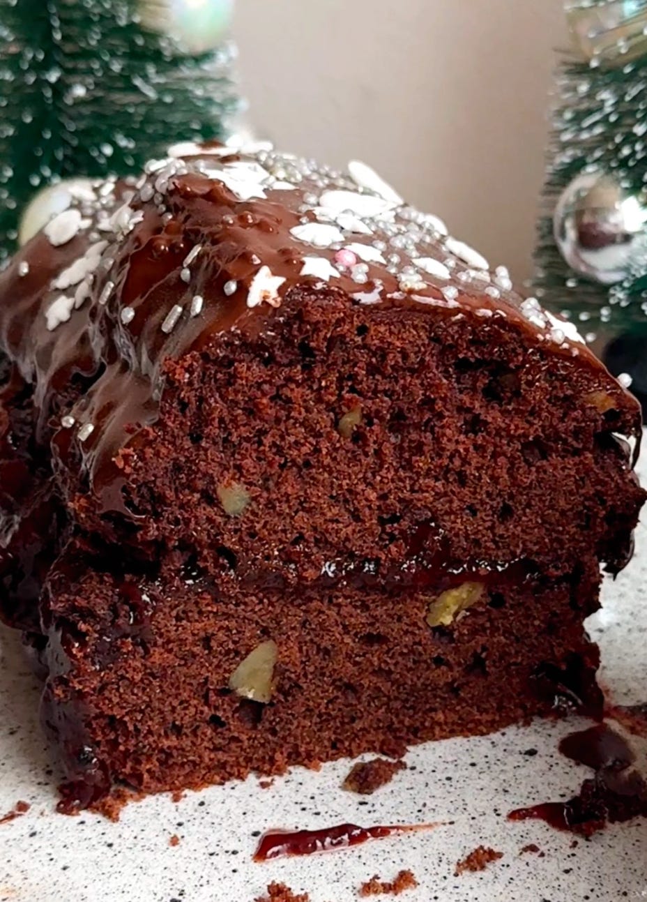 Wyjmij z keksówki, przekrój, posmaruj czekośliwką, złóż i polej polewą czekoladową. Udekoruj posypkami/żurawiną/rozmarynem/jadalnym brokatem. GOTOWE!