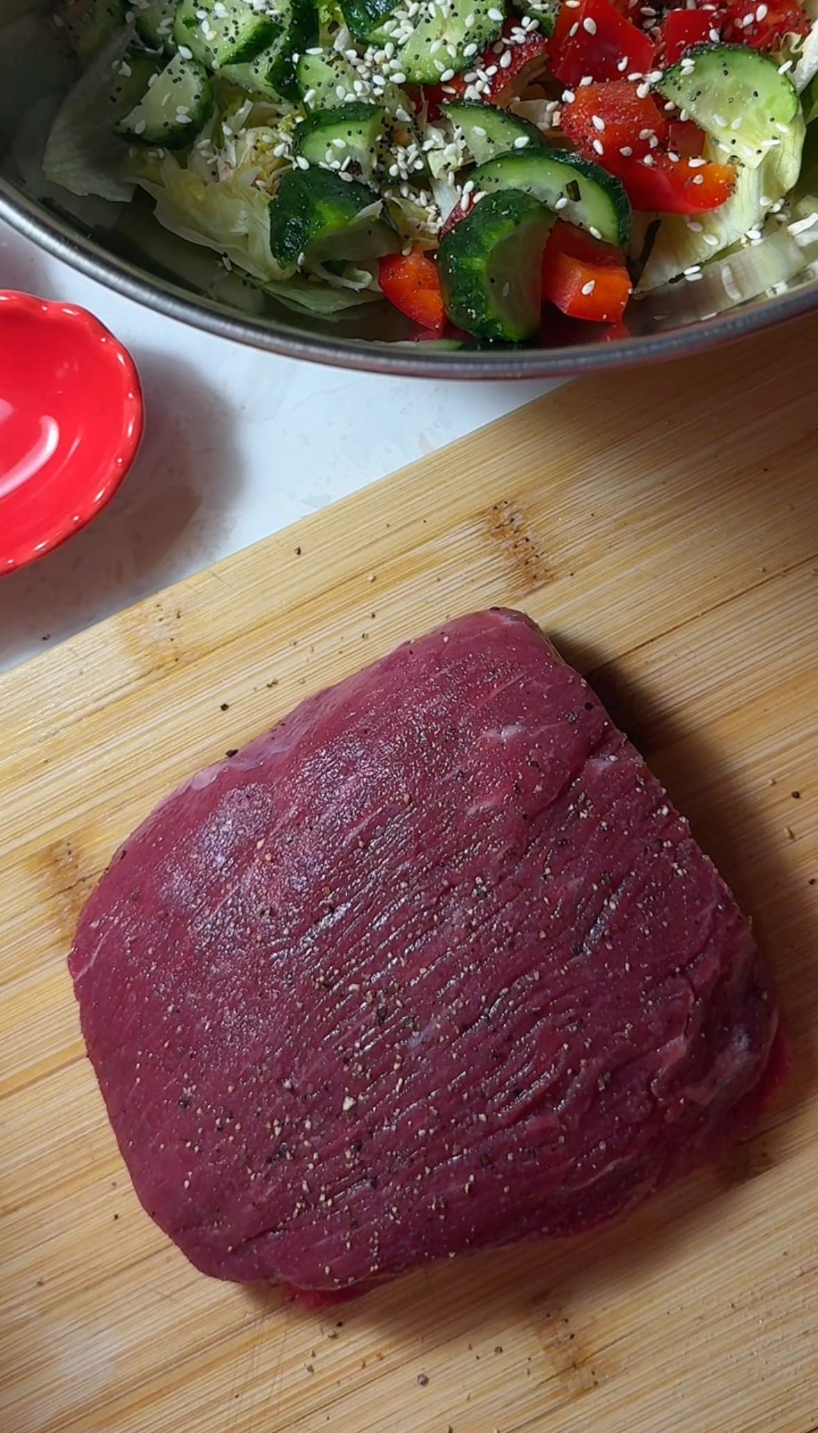 Możesz oczywiście smażyć dłużej, choć ja polecam w tym momencie zdjąć grubą polędwicę z patelni, daj jej odpocząć, pokroić ją w plastry i ewentualnie jeszcze króciótko dosmażać plastry, jeśli mięso jest w Twoim mniemaniu za surowe.