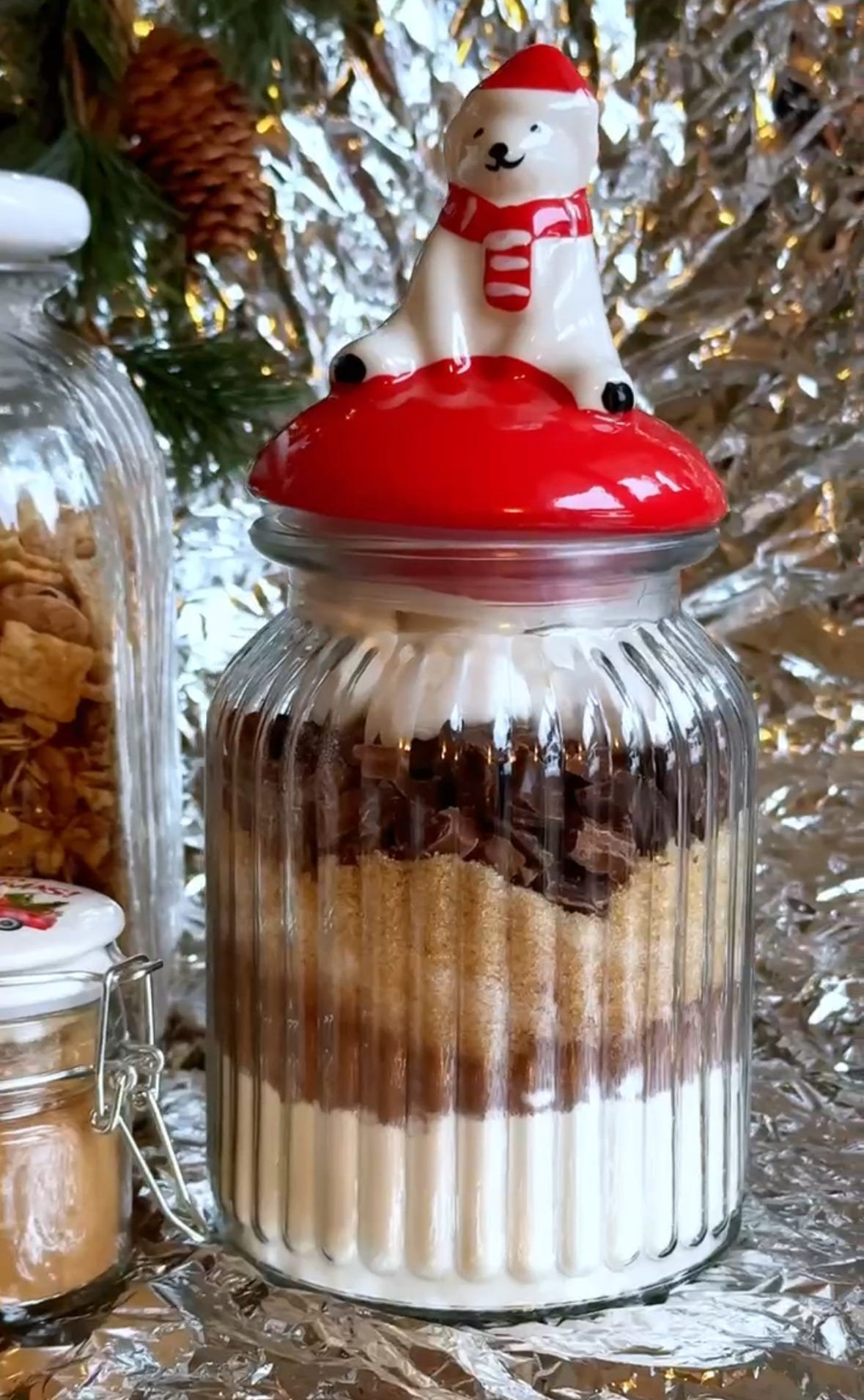 Suche składniki układaj warstwowo (aby kontrastowały) w słoju 11 x 24 cm (ok 2 l). Pianki muszą być na górze słoja.