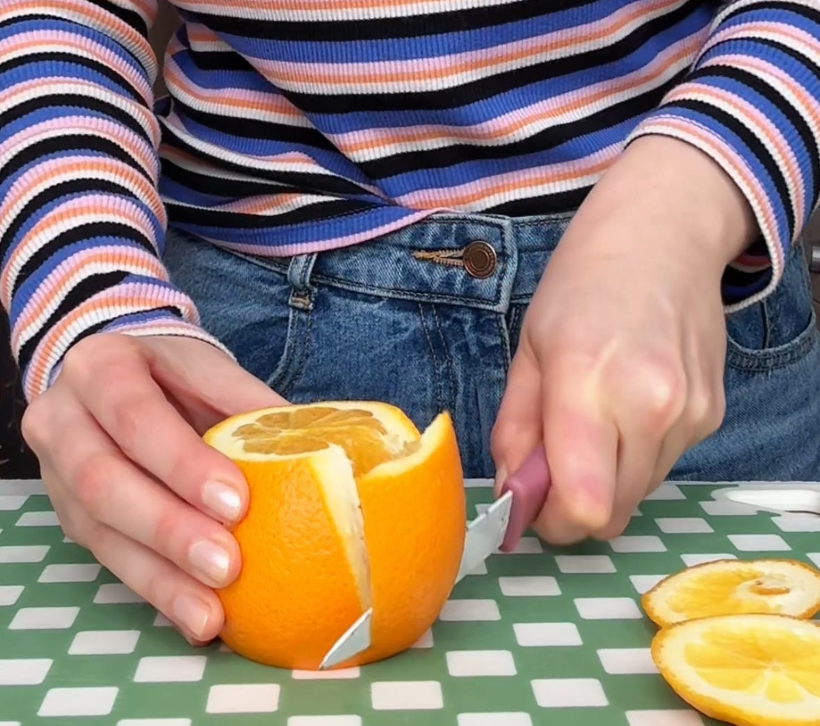 Pomarańcze obierz nożem, usuwając białą skórkę. Pokrój w plastry.