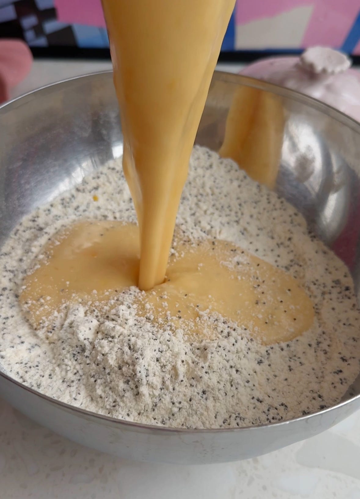 W dużej misce połącz mąkę pszenną, mak, mąkę migdałową, proszek do pieczenia i sól. W innej misce rozetrzyj palcami cukier ze skórką cytrynową, aż cukier stanie się wilgotny i aromatyczny.